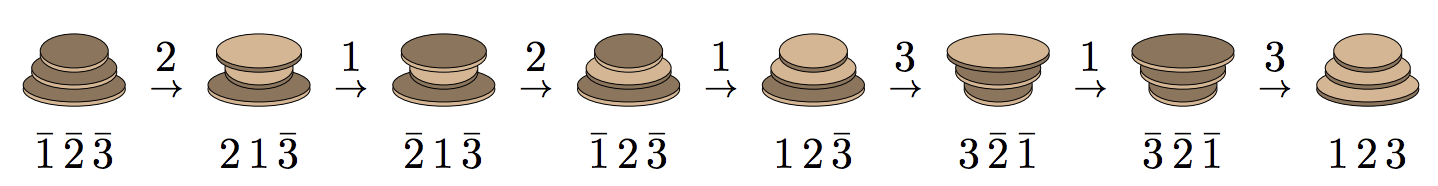 For example, the image below illustrates how a stack of 3 pancakes with burnt side up can be sorted so the pancakes are stacked smallest to largest (starting at the top) with burnt side down.