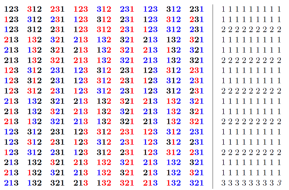 A listing of all colored permutations of $\{1,2,3\}$ with $c=3$ colors (black, red, blue) is shown below (read top to bottom, left to right):