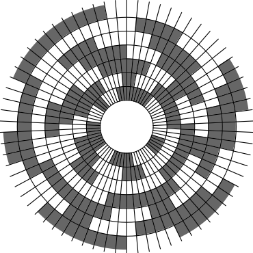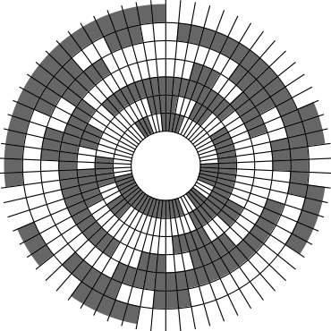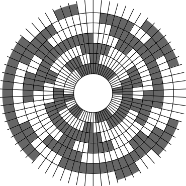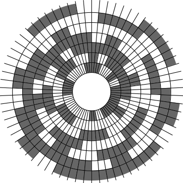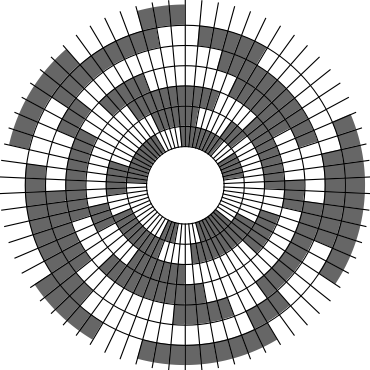 In Problem 56 in Section 7.2.1.3 of his book [Knu11], Knuth raised a stronger version of the middle levels conjecture. He asks for a solution in which the flip sequence, i.e., the sequence of bit positions flipped in each step, can be subdivided into $2n+1$ blocks $\alpha_0,\alpha_1,\ldots,\alpha_{2n}$ of the same length, and the $i$th block $\alpha_i$ is obtained from the initial block $\alpha_0$ by element-wise addition of $i$ modulo $2n+1$ for all $i=1,\ldots,2n$. This allows encoding the entire flip sequence by a factor $2n+1$ more compactly, which was a crucial ingredient in early attempts to tackle the middle levels conjecture experimentally with computer help (see the paper by Shields and Savage [SS99]). For example, such a solution with cyclic symmetry for $n=3$ is given by $\alpha_0=6253462135$. Starting at the bitstring $x=1110000$, applying the flip sequence $\alpha_0$ yields the sequence of strings $1110000,1110010,1010010,1010110,1000110,1001110,\ldots,0111000$, i.e., after 10 flips we reach a bitstring that differs from the initial string $x$ by cyclic right-rotation by one position. More generally, after applying $\alpha_0,\ldots,\alpha_{i-1}$ for all $i=1,\ldots,2n+1$, we reach a copy of $x$ that is cyclically shifted to the right by $i$ positions. Knuth's conjecture was proved by Merino, Mička and Mütze [MMM20] in a more general form, allowing for an arbitrary shift $s\in\{1,\ldots,2n\}$ that is coprime to $2n+1$, i.e., $\alpha_i$ is obtained from $\alpha_0$ by element-wise addition of $i\cdot s$ modulo $2n+1$ for all $i=1,\ldots,2n$. It is not hard to see that the condition on $s$ to be coprime to $2n+1$ is necessary and cannot be omitted. An implementation of this algorithm, using linear time for each generated bitstring, was also provided in the paper [MMM20], and this is the second algorithm running on this website ($(2n+1)$-fold symmetry). The cyclic symmetry can be seen nicely in the wheel diagrams below, which show solutions for $n=3$ and $s=1,\ldots,6$. The animation shifts the bits cyclically around on a torus. Click on each figure to start/stop the animation.